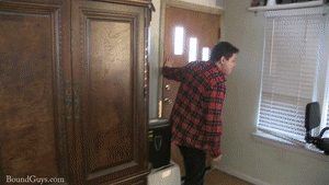 Aaron flexed and pushed and rolled all over the floor desperately trying to get free. Each time he jerked agaisnt the cruel ropes the pulled and cut viciously into his tender skin. But it was all to no avail. He just could not get loose. In desperation he rolled over onto his stomach and stared at the clock he had been struggling for a very long time it was getting late and the match was over any minute his brothers would come storming in and then he would really be done for.